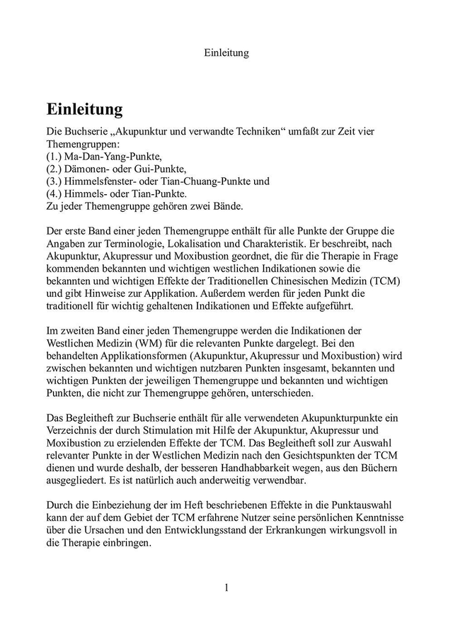Das Begleitheft ist Bestandteil der Buchserie "Akupunktur und verwandte Techniken". Sie umfaßt gegenwärtig vier Themengruppen: (1.) die Ma-Dan-Yang-Punkte, (2.) die Dämonen- oder Gui-Punkte, (3.) die Himmelsfenster- oder Tian-Chuang-Punkte und (4.) die Himmels- oder Tian-Punkte.